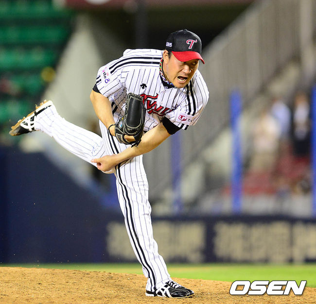 9회 2사 한화 김태균을 상대로 LG 마무리 투수 봉중근이 힘차게 공을 뿌리고 있다./greenfield@osen.co.kr