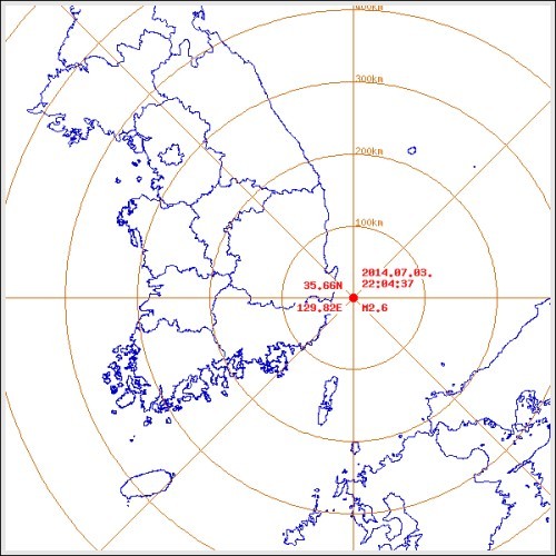 기상청에 따르면, 3일 오후 9시57분 울산 동구 동북동쪽 35km 해역에서 규모 3.5의 지진이 발생한 후 7분 만에 동북동쪽 40km 해역서 2.6 규모의 여진이 발생했다.