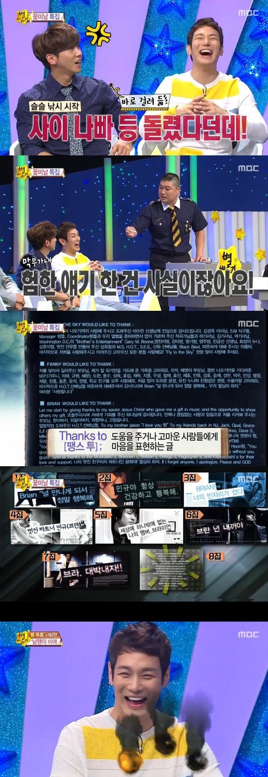 특히 강호동은 플라이투더 스카이 8집 앨범 탱스투에 환희가 브라이언의 이름을 넣지 않은 점을 지적해 환희를 진땀나게 만들었다.