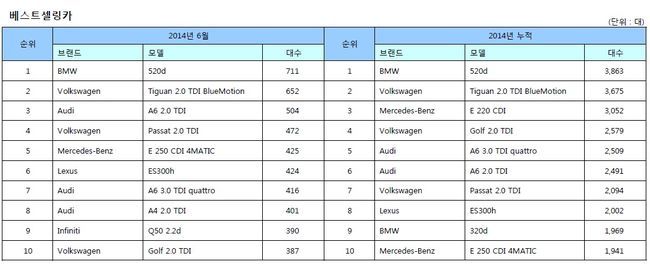 베스트셀링 모델은 비엠더블유 '520d(711대)', 폭스바겐 '티구안 2.0 TDI 블루모션(652대)', 아우디 'A6 2.0 TDI(504대)' 순이었다.