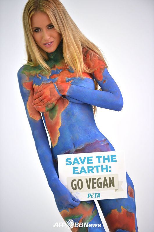 동물애호단체 페타는 목축업, 축산업 등이 환경파괴와 이상기후, 자원 부족을 불러일으킨다고 주장하고 있다. 페타는 이날 엄격한 채식주의 식단으로 환경을 보호하자는 광고를 만들었다. 엄격한 채식주의자들은 고기, 생선은 물론 우유나 달걀도 먹지 않는다. / photo@osen.co.kr < 사진 > ⓒAFPBBNews = News1