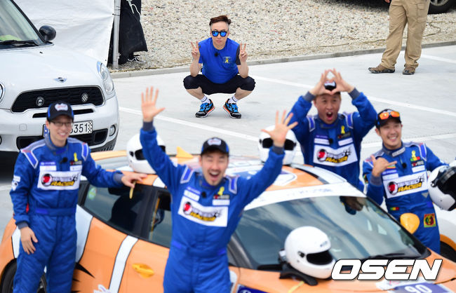 4일 오전 인천 연수구 국제업무지구역 인근에서 열린 코리아 스피드 페스티벌(KSF) 연습주행에서 박명수가 포토타임 시간을 갖고 있는 유재석, 노홍철, 하하, 정준하를 바라보고 있다.