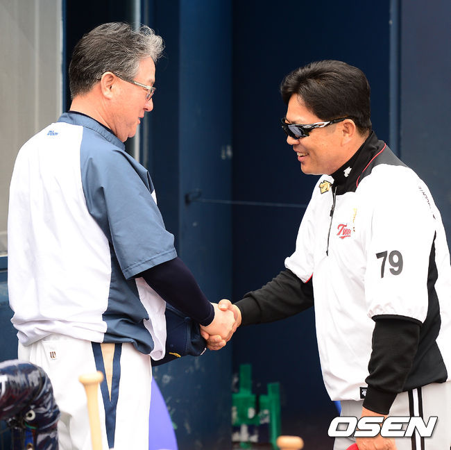 경기에 앞서 NC 김경문 감독과 LG 양상문 감독이 인사를 나누고 있다.