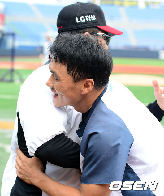 경기에 앞서 LG 양상문 감독이 NC 이종욱이 인사를 나누고 있다.