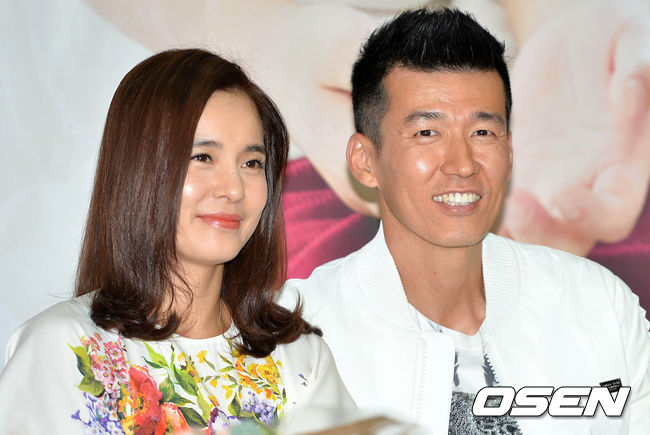 기자간담회에 참석한 정혜영과 션이 미소를 짓고 있다.