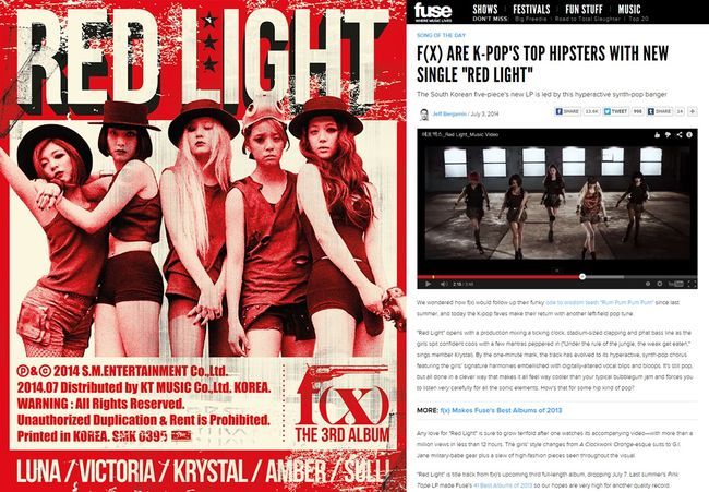 미국 음악 전문 케이블 FUSE TV는 지난 3일(현지시각) ‘f(x), 새 앨범 ‘레드라잇’으로 트렌드를 이끌다’(f(x) Are K-Pop's Top Hipsters With New Single "Red Light”)라는 제목의 기사를 통해 f(x)의 정규 3집 타이틀 곡 ‘레드라잇’을 호평해 f(x)의 글로벌한 인기와 위상을 다시 한번 확인케 했다.