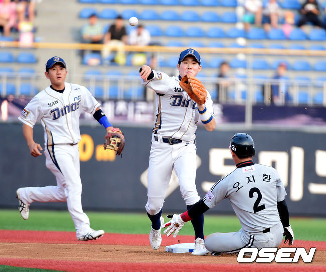 1회초 무사 1루에서 NC 박민우가 LG 손주인의 유격수 땅볼에 오지환을 포스아웃시키고 1루로 송구하고 있다. 박민우의 악송구 실책으로 손주인은 세이프.