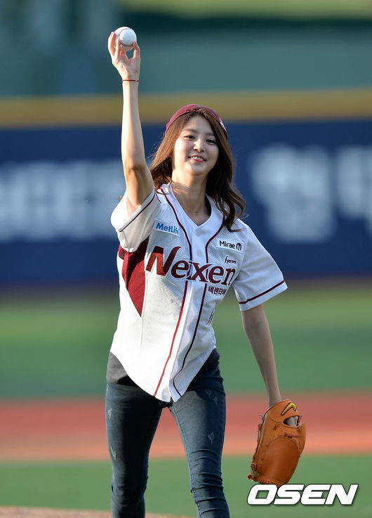 경기에 앞서 걸그룹 EXID 정화가 시구를 하고 있다.