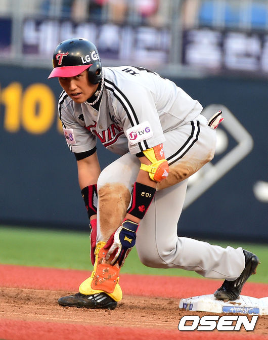 2회초 무사에서 LG 채은성이 2루타를 날리고 타임을 외치고 있다.