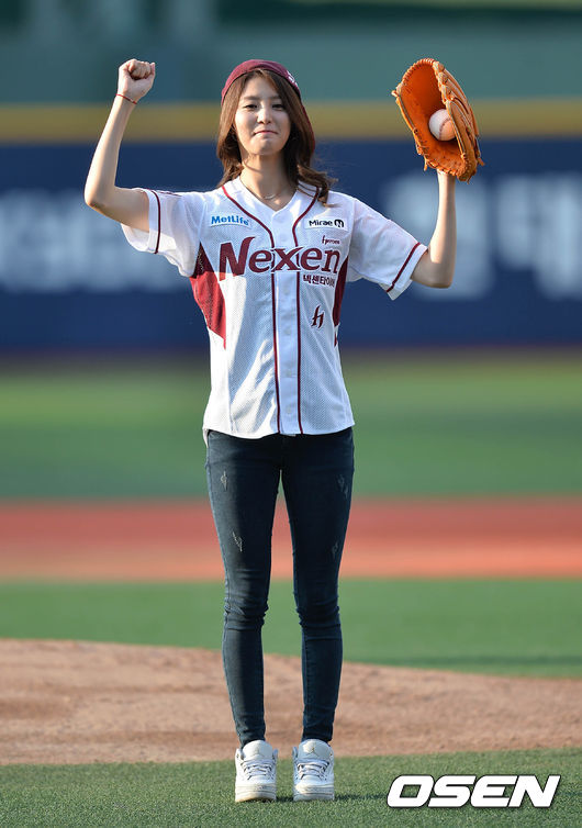 경기에 앞서 걸그룹 EXID 정화가 시구를 하고 있다.