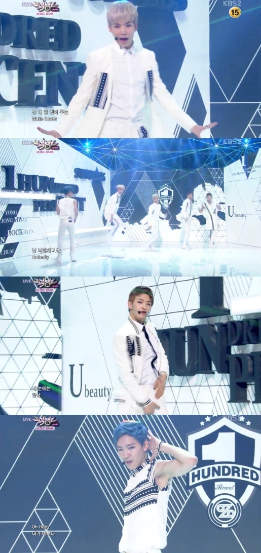 백퍼센트는 4일 오후 방송된 KBS 2TV 음악 프로그램 '뮤직뱅크'에서 신곡 ‘니가 예쁘다’를 열창하며 컴백무대를 가졌다.