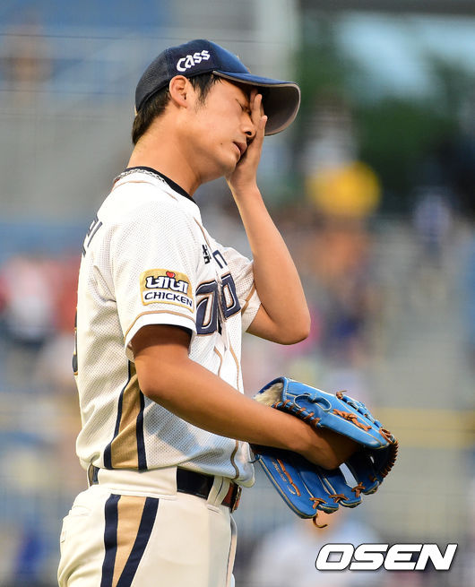 3회초 1사에서 NC 이성민이 LG 정성훈의 투수앞 땅볼 타구를 직접 처리하고 땀을 닦고 있다.