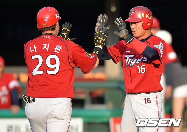 1회초 2사 3루에서 KIA 나지완이 좌중월 투런 홈런을 치고 홈에서 3루주자 김주찬과 하이파이브를 하고 있다.