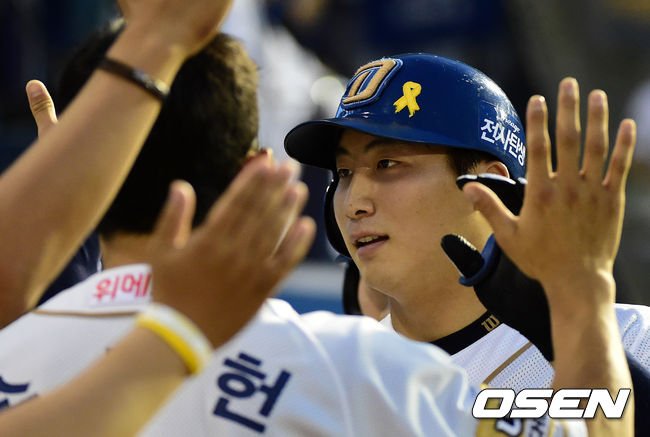 4회말 1사 2루에서 NC 나성범이 추격의 투런포를 날리고 더그아웃에서 동료선수들과 하이파이브를 하고 있다.