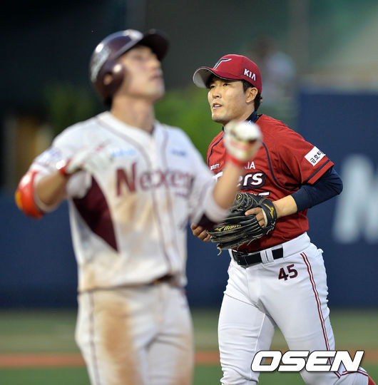 4회말 2사 3루에서 넥센 서건창을 내야땅볼로 처리한 KIA 김병현이 더그아웃으로 가고 있다.