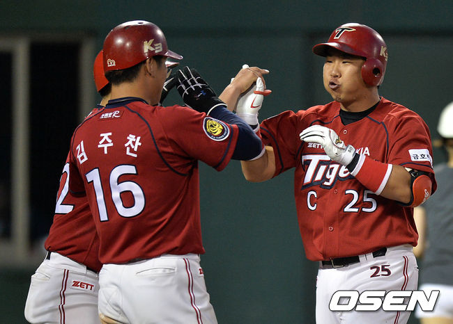 5회초 2사 만루에서 KIA 이범호가 만루 홈런을 치고 홈에서 동료들과 하이파이브를 하고 있다.