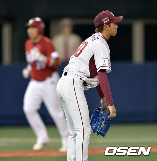 5회초 2사 만루에서 KIA 이범호에게 만루 홈런을 허용한 넥센 하영민이 아쉬운 표정을 짓고 있다.