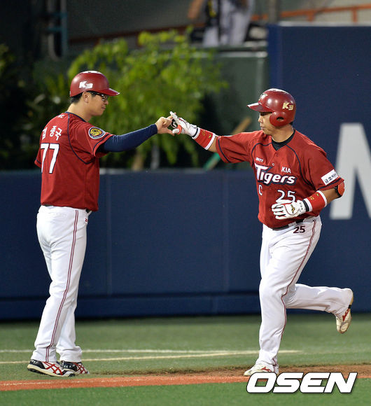 5회초 2사 만루에서 KIA 이범호가 만루 홈런을 치고 김종국 코치와 하이파이브를 하고 있다.