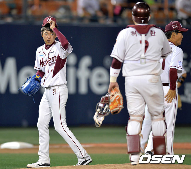 6회초 2사 1,3루에서 넥센 하영민이 마운드를 내려가고 있다.