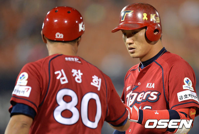 6회초 2사 1,2루에서 KIA 김주찬이 중전 적시타를 치고 김창희 코치와 하이파이브를 하고 있다.