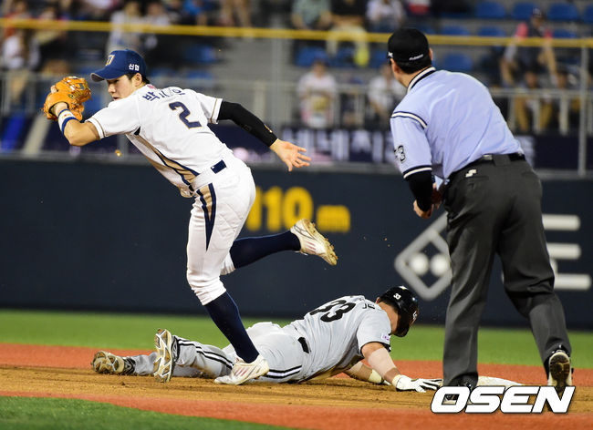 7회초 2사 2루에서 LG 박용택이 NC 이태원의 견제에 박민우에 태그아웃 당하고 있다.