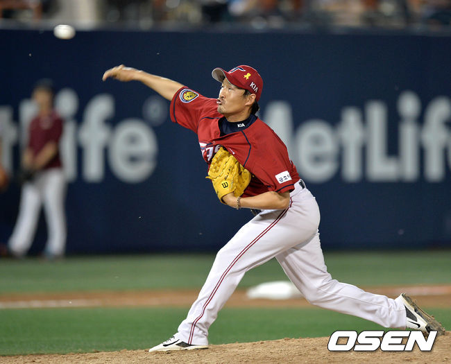6회말 KIA 김태영이 힘차게 공을 던지고 있다.
