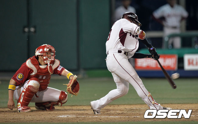 6회말 2사 2,3루에서 넥센 문우람이 중전 2타점 적시타를 치고 있다.