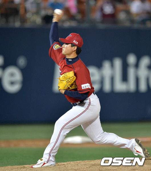 6회말 KIA 최영필이 힘차게 공을 던지고 있다.