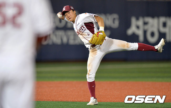 7회초 1사에서 넥센 김하성이 KIA 안치홍의 땅볼타구를 잡아 1루로 송구하고 있다.