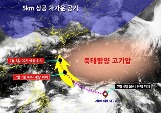 8일 이후에는 중국 중북부에서 동진하는 대기 상층 기압골의 영향을 받을 가능성이 있다. 이 시점에 태풍 너구리가 제주에 상륙할지 여부가 갈릴 전망이다.
