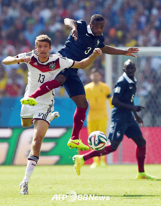 전반 독일 토마스 뮐러와 프랑스 파트리스 에브라가 공중볼 다툼을 하고 있다./photo@osen.co.kr