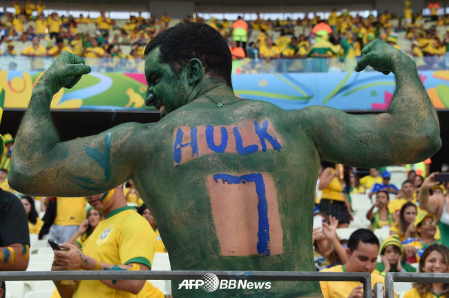 경기에 앞서 헐크 분장을 한 축구팬이 열띤 응원을 펼치고 있다.