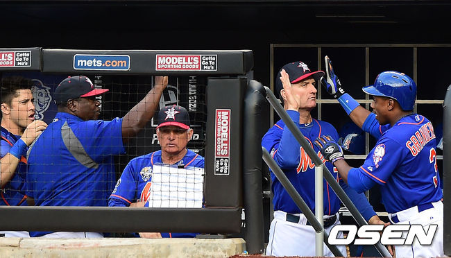 1회말 2사 2루 뉴욕 메츠 그랜더슨이 아브레유가 적시타로 득점을 올린 뒤 기뻐하고 있다.