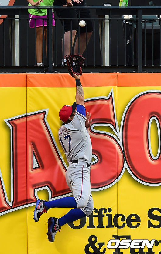 1회말 2사 2루 텍사스 추신수가 뉴욕 메츠 두다의 홈런타구를 잡기위해 점프캐치를 시도하고 있다.
