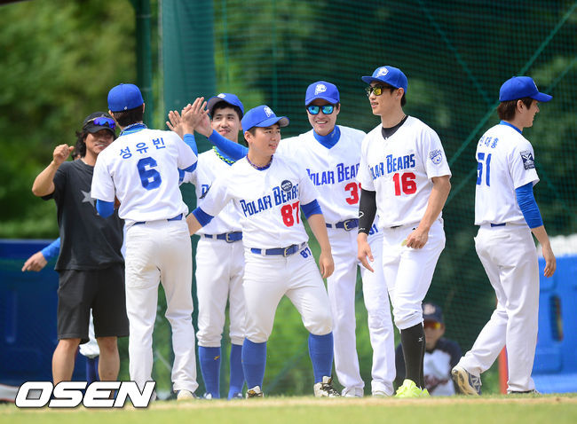 승리한 폴라베어스 선수들이 승리의 기쁨을 나누고 있다.