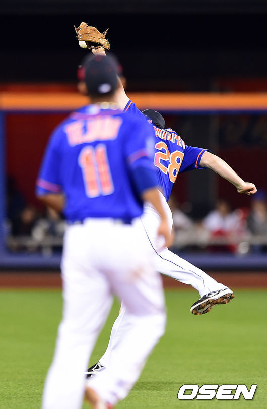 8회초 2사 1루 뉴욕 메츠 머피가 텍사스 앤드루스의 타구를 잡으려다 놓치고 있다.