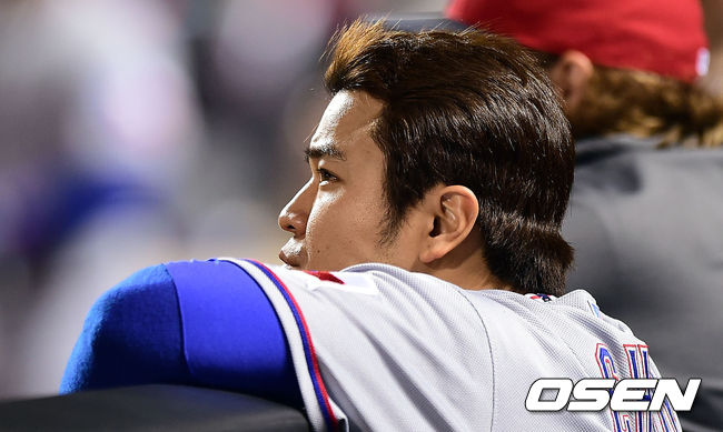 9회초 텍사스 추신수가 더그아웃에 앉아 경기를 관전하고 있다.
