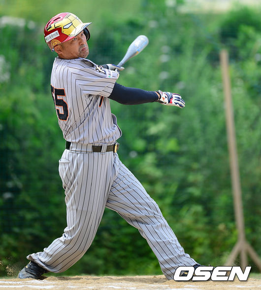 1회초 풍산화이터스의 한성희가 아이언맨 헬멧을 쓰고 나와 스윙을 하고 있다.