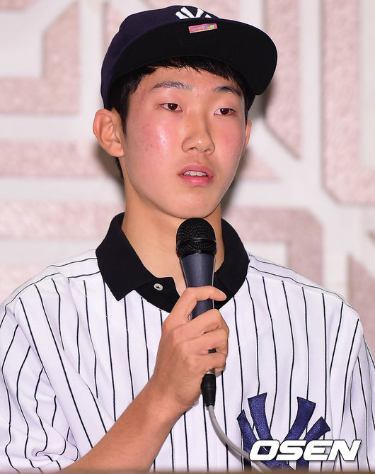미국 메이저리그 뉴욕 양키스에 신인지명된 박효준이 5일 오후 서울 광장동 워커힐호텔에서 열린 입단식에 참석해 인사말을 하고 있다.