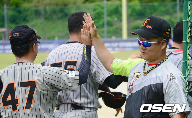 풍산화이터즈가 대승을 거두고 하이파이브를 하고 있다.