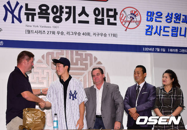 미국 메이저리그 뉴욕 양키스에 신인지명된 박효준이 5일 오후 서울 광장동 워커힐호텔에서 열린 입단식에 참석해 유니폼을 전달받은 뒤 부모님, 양키스 부사장 도니 로랜드와 스카우터 스티브 윌슨과 인사를 나누고 있다.
