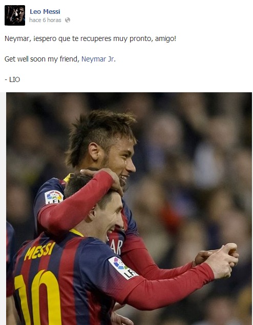 ‘축구 황제’ 리오넬 메시(27, 바르셀로나)가 바르셀로나 동료인 네이마르(22, 바르셀로나)의 부상에 안타까움을 드러냈다.