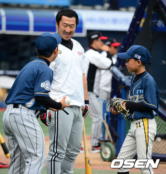 경기에 앞서 LG 이병규가 볼보이와 이야기를 나누며 즐거워하고 있다.