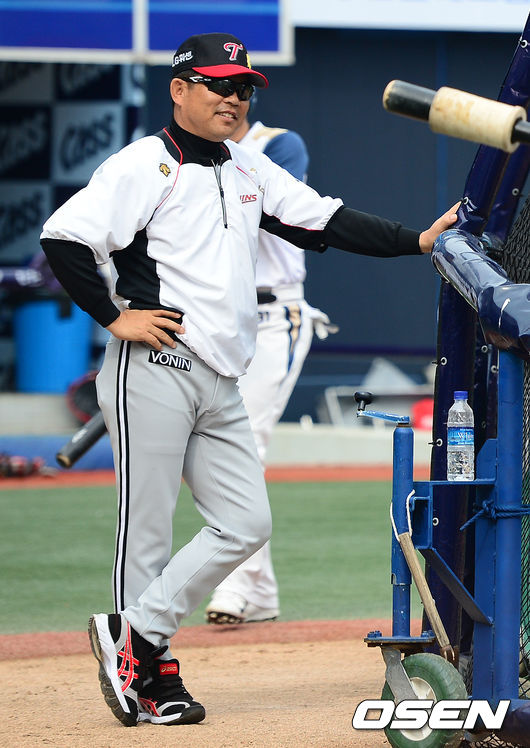 경기에 앞서 LG 양상문 감독이 훈련을 지켜보며 미소짓고 있다.
