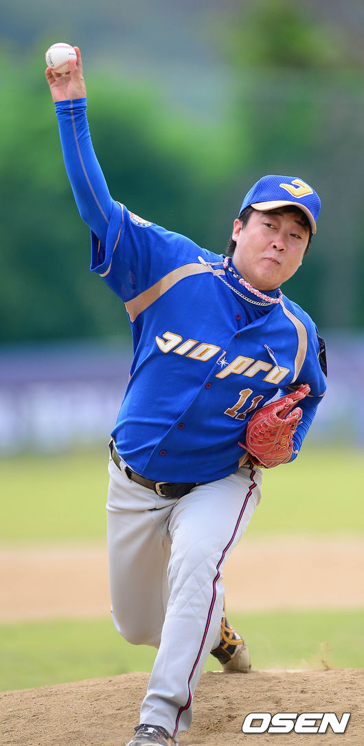 1회말 지오스포츠 야구단 선발 투수 김범준이 역투를 펼치고 있다.