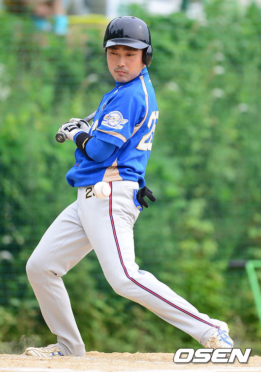 2회말 2사 주자 1,2루 지오스포츠 야구단 전지오 선수가 몸에 공을 맞고 있다.