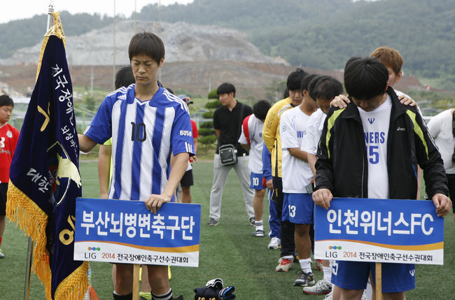 ‘LIG 2014 전국장애인축구선수권대회’ 개막식은 목포국제축구센터가 진도항과 가깝고 세월호 침몰 희생자에 대한 추모와 유가족의 아픔을 함께 하겠다는 취지에서 묵념으로 차분하게 진행했다. 권중원 대한장애인축구협회 회장대행의 대회사, 박홍률 신임 목포시장의 환영사, 박지원 목포지역 국회의원의 축사 외에 선수단 대표의 선서 등 최소한의 일정만 진행했다.