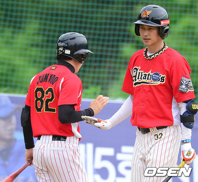3회말 2사 주자 2,3루 알바트로스 이승준의 안타에 3루주자 최준우가 득점에 성공해 하이파이브를 하고 있다.