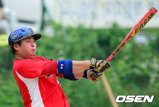 5회말 무사 주자 1루 알바트로스 이종섭이 호쾌한 2루타를 치고 있다.