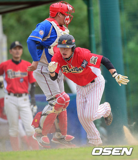 5회말 1사 주자 1,3루 알바트로스 이학선의 뜬공에 태그업을 시도하다 런다운에 걸려 포수를 피하고 있다.